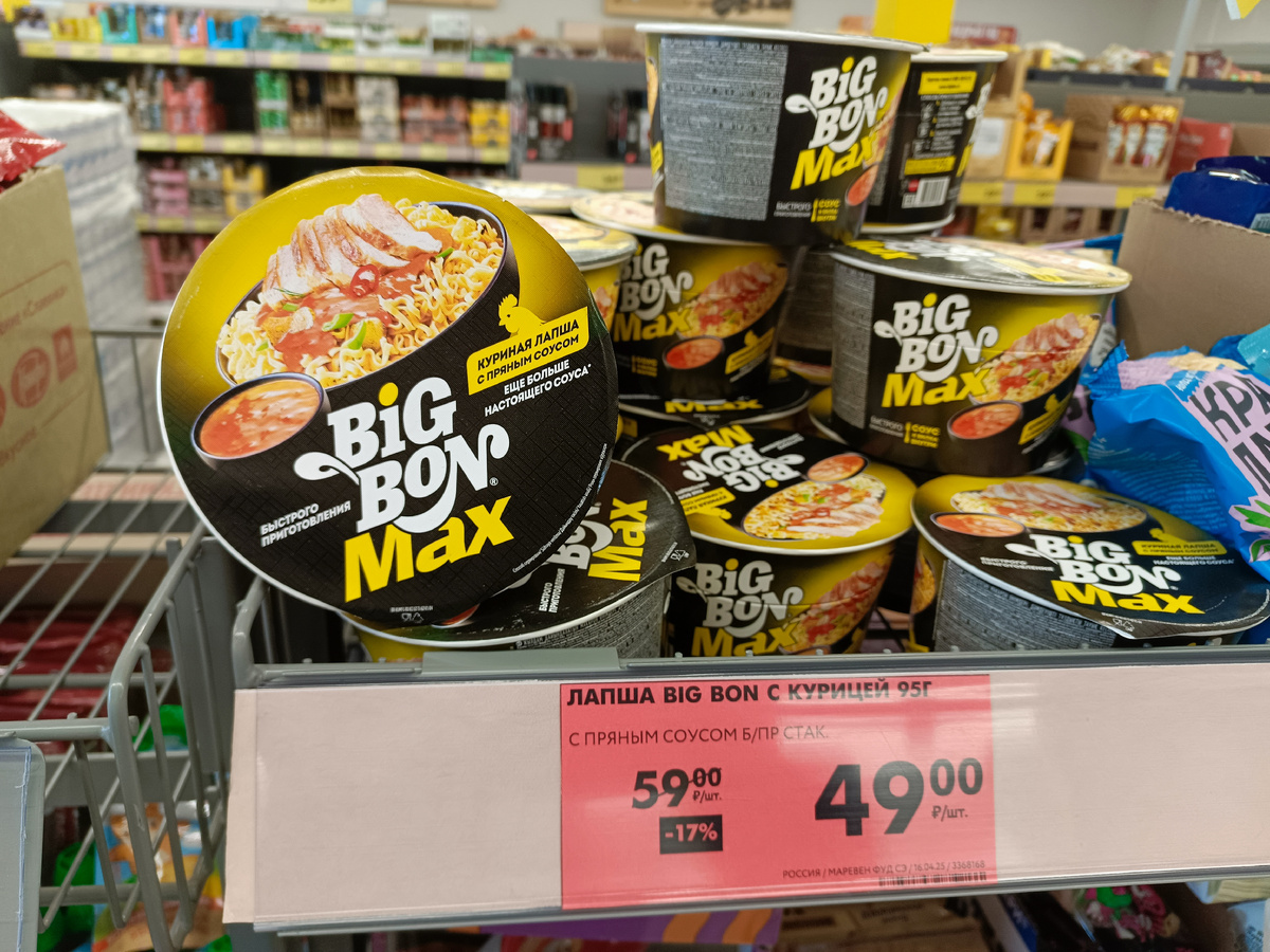 Среди продуктов быстрого приготовления популярна лапша BIG BON с куриным вкусом и пикантным соусом в упаковке 95 г, стоимость которой составляет 49 рублей. Автор обзора лично не является поклонником таких продуктов, отдавая предпочтение натуральным блюдам, но покупка доступна и востребована.