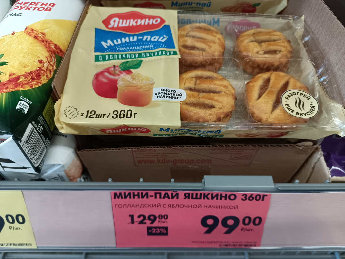 Сладкоежкам стоит обратить внимание на мини-пай с яблочной начинкой весом 360 г по акции за 99 рублей.