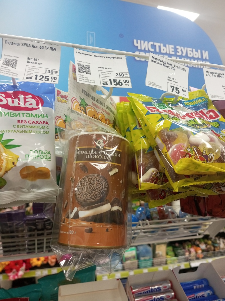 Товары типа "банки с сюрпризом" кажутся пережитком прошлого, когда казалось, что такая игрушка может кого-то заинтересовать. Сейчас даже акция не спасает этот товар от ощущения ненужности — внутри банки вместо обещанных вкусностей оказывается лишь бумажка.