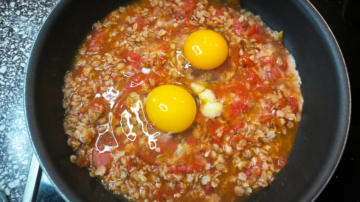 В конце приготовления кладут кусочек топленого масла — его мягкое благоухание отлично уравновешивает вкусы. Затем аккуратно разбивают сверху одно или два яйца (в зависимости от размера и аппетита). Блюдо снова накрывают крышкой и продолжают готовить пару минут, пока белок не схватится, а желток останется нежно жидким. Такая текстурная игра делает блюдо особенно привлекательным.