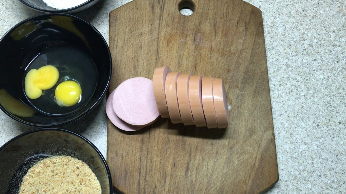 Для классического варианта традиционно используется варёная колбаса, предпочтительно «докторская» или «молочная», с низким содержанием жира — именно такая колбаса сохраняет форму и сочность при обжаривании.