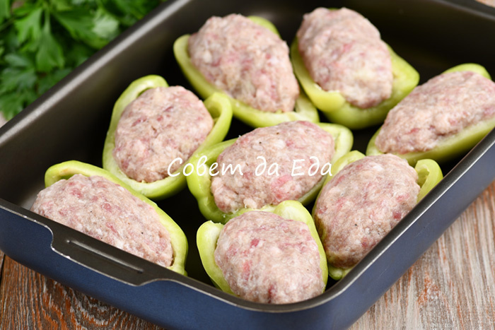 Сладкие перцы среднего размера разрезают вдоль, удаляют семена и смазывают внутреннюю часть маслом. Фарш из свинины и говядины дополняют крупно натёртым луком и размоченным батоном, солят и перчат по вкусу. Котлеты формируют и укладывают в половинки перцев, затем выкладывают в форму. Все заливают приготовленным соусом.