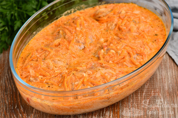 Для первого варианта овощи обжаривают до полуготовности: репчатый лук нарезают полукольцами, морковку измельчают соломкой и слегка пассеруют с растительным маслом. К ним добавляют специи, муку, сметану и томатную пасту с чесноком, а затем прогревают до загустения соуса.