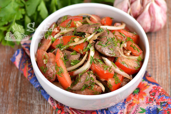 Этот салат сочетает в себе нежность печени и яркие овощные нотки. Печень обжаривают на масле с солью и перцем до готовности. Затем её остужают и смешивают с ломтиками помидоров, предварительно освобожденных от семян, чтобы сохранить структуру салата.