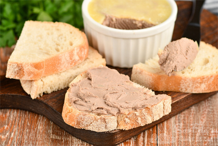 Этот паштет отличается кремовой текстурой и тонкой фруктовой кислинкой. Печень тушат на сливочном масле вместе с кусочками кислых яблок, что придает блюду интересный вкус и мягкость. На среднем огне ингредиенты готовятся около 10 минут, после чего их солят, перчат и добавляют сушеные травы, например базилик.