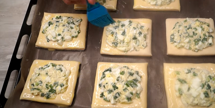 Готовый пласт слоёного теста делят на две части, а каждую из них — на четыре квадрата. В центр каждого квадратика укладывают начинку. Для красоты и мягкости поверхностей при желании можно смазать тесто взбитым яйцом. Далее пирожки размещают на противне, выстланном бумагой для выпечки или смазанном маслом.