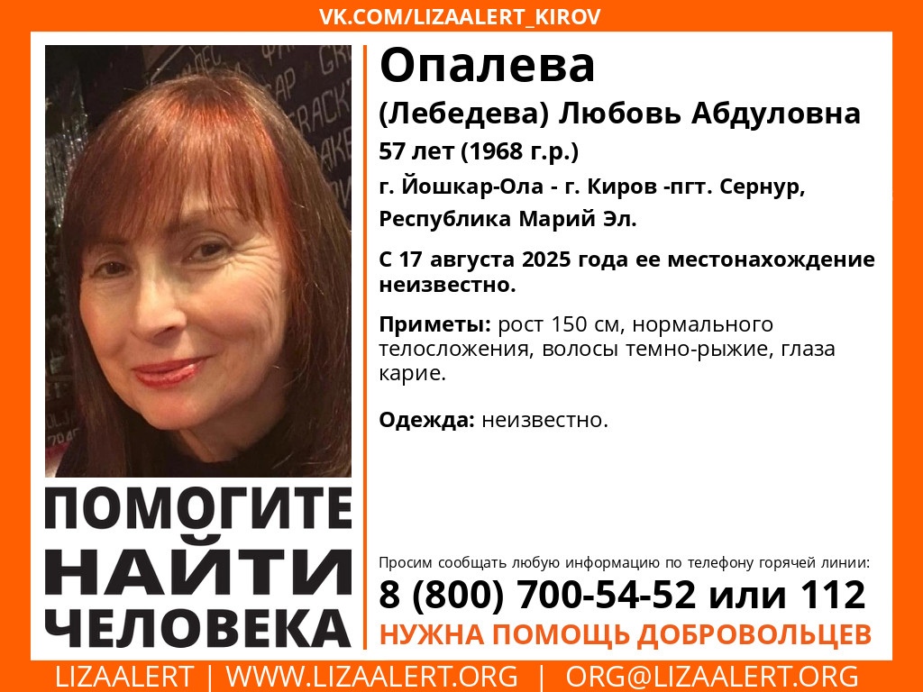 В Кировской области продолжаются поиски 57-летней Любови Абдуловны Опалевой (Лебедевой). Об этом проинформировали в паблике поискового отряда "ЛизаАлерт" по региону.