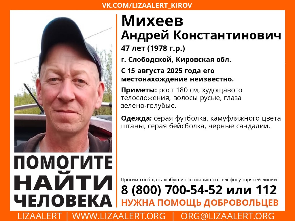В Слободском Кировской области ищут 47-летнего Андрея Константиновича Михеева. Сведения об этом размещены в сообществе поисково-спасательного отряда "ЛизаАлерт" по региону.