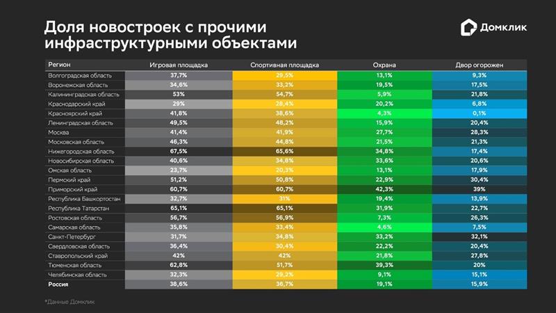 Аналитики Домклик изучили рынок новостроек и строящихся многоквартирных домов России. Объектом исследования стала доступность и наличие в новых ЖК социальной инфраструктуры – школ и детских садов, а также новостройки, где в распоряжении новых жильцов окажутся детские игровые и спортивные площадки, огороженная территория и охрана.