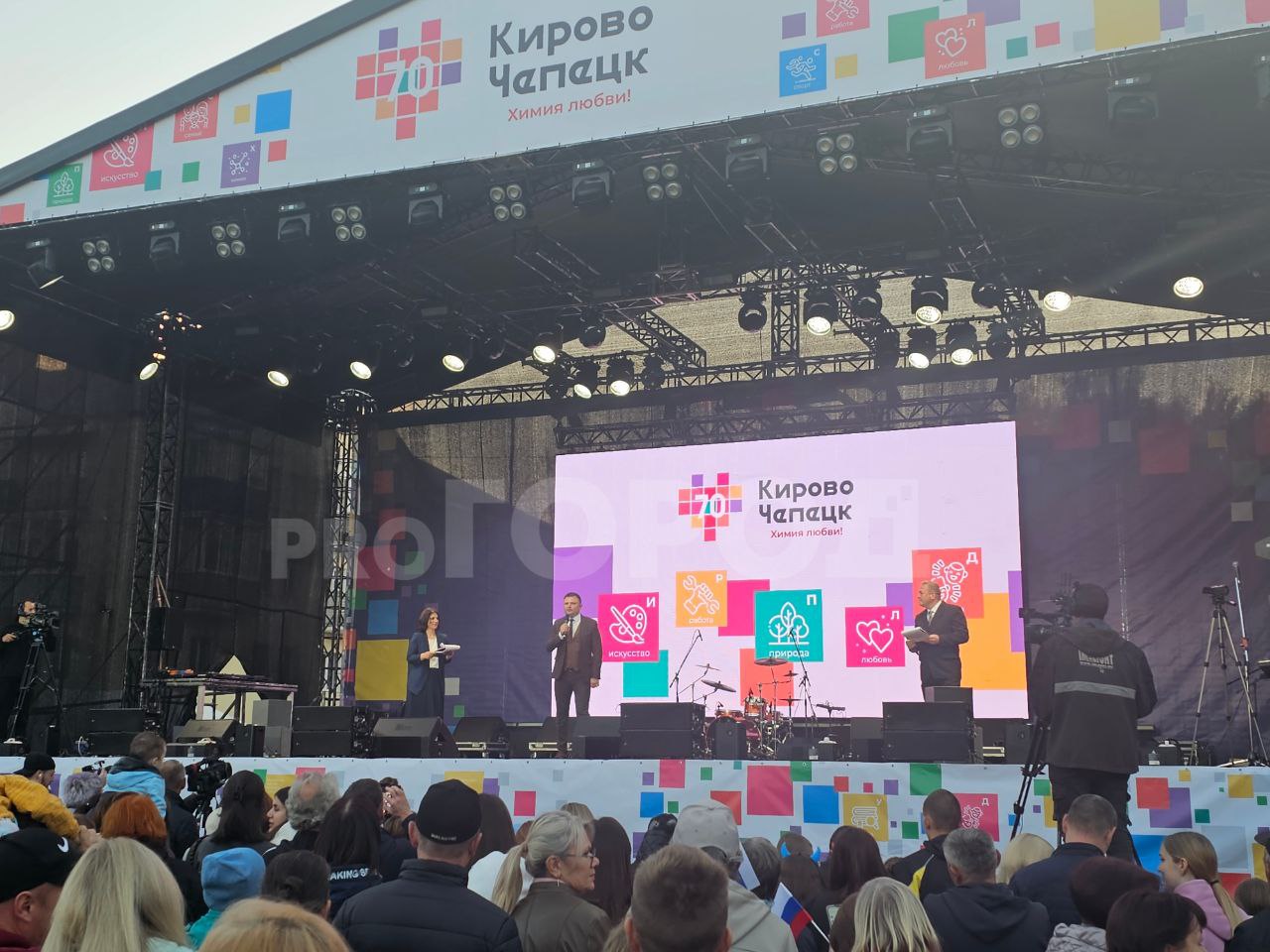 Через час началась программа, когда известные уроженцы Кирово-Чепецка вышли на сцену, чтобы поздравить любимый город с праздником. Выступили Екатерина Реутова – участница группы «Роднополисы», Владимир Стариков – клоун, артист цирка, легенда Большого Московского цирка, Екатерина Чекрыжева – балерина, солистка театра "Кремлевский балет", Валентин Кощеев и Валентина Булдакова бывшие участники группы "Нон-стоп", Александр Колачев – основатель коллектива «Невский проспект» (трибьют группы "Ленинград") и певец Дмитрий Бурлаков.