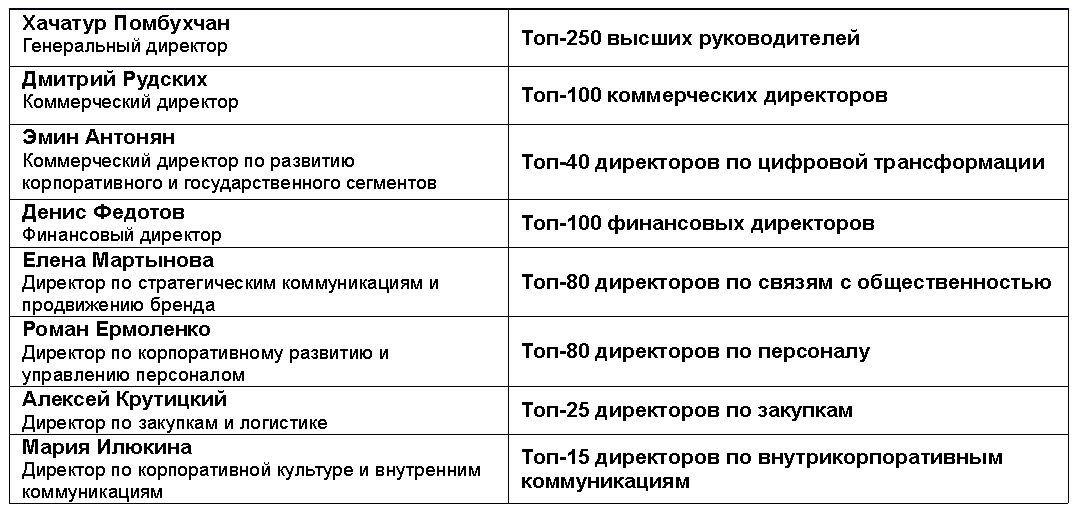 Также в тройку лучших вошли директор по связям с госорганами Владимир Месропян, директор по правовым вопросам Сергей Переверзев, директор по развитию корпоративного бизнеса Наталья Талдыкина, директор по бренду и маркетинговым коммуникациям Татьяна Гура, директор по складской и транспортной логистике Татьяна Гусева, директор ИТ-инфраструктуры Павел Табашников, руководитель проектов по социальным программам Оксана Туранцева и корпоративный секретарь Дарья Лизунова.