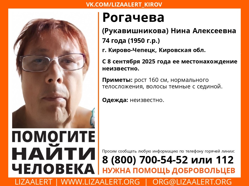 В Кирово-Чепецке организованы масштабные поиски 74-летней Нины Алексеевны Рогачевой (Рукавишниковой), которая пропала 8 сентября. Об этом сообщили в паблике "ЛизаАлерт" по региону.