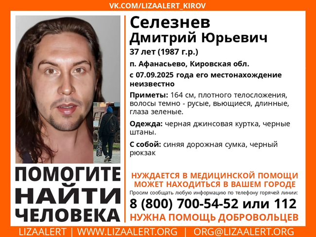 Приметы разыскиваемого: рост 164 см, телосложение плотное, волосы длинные темно-русые, глаза зеленого цвета. В момент исчезновения он был одет в черные джинсы и куртку такого же цвета. При себе может иметь синюю дорожную сумку и черный рюкзак. Всех, кто располагает какой-либо информацией о местонахождении бесследно исчезнувшего, просят связаться с волонтерами "ЛизаАлерт".