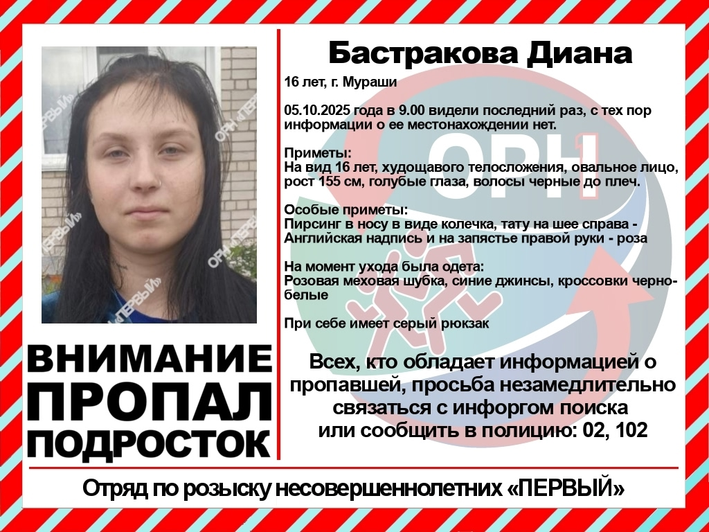 В Кировской области пропал подросток. Девушку зовут Диана Бастракова. Ориентировку опубликовали в сообществе Отряд по розыску несовершеннолетних "Первый".