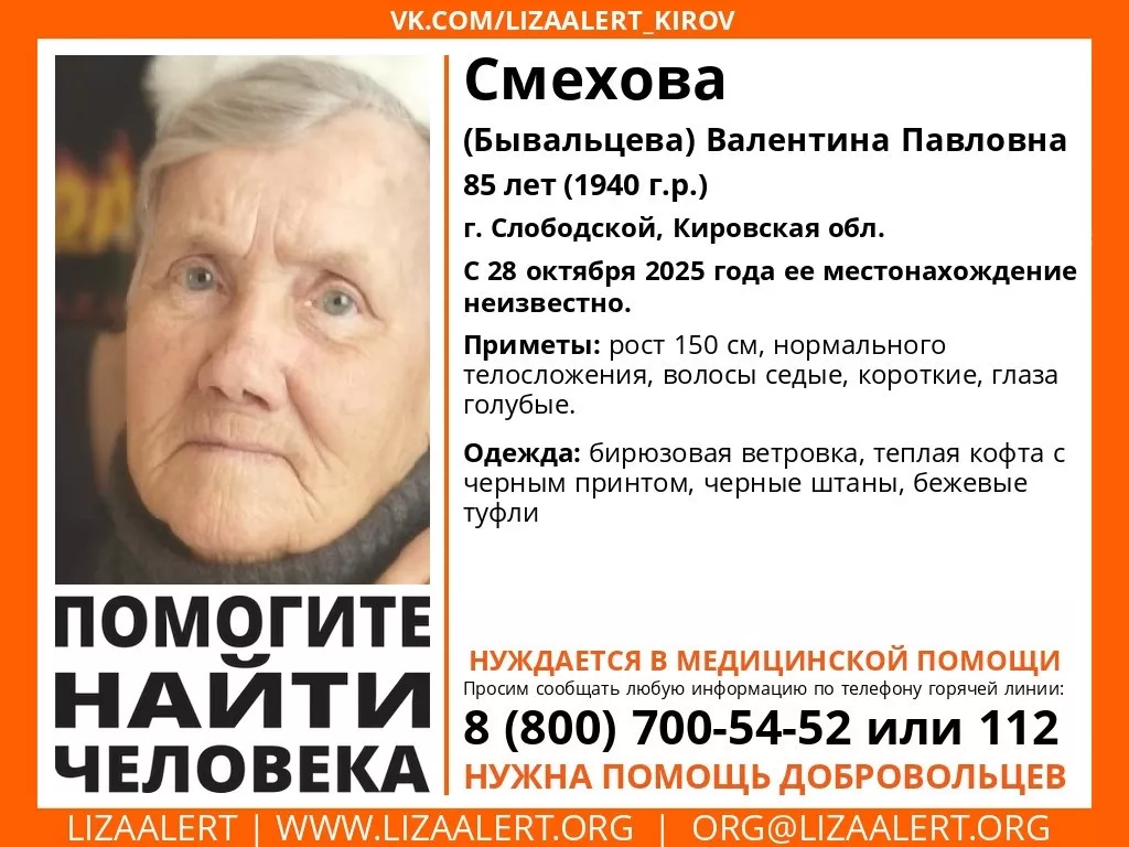 В Слободском пропала 85-летняя Валентина Смехова (Бывальцева), и поисково-спасательная группа "Лиза Алерт" незамедлительно начала ее поиски. Уточняется, что последний раз женщину видели 28 октября, днем ранее.