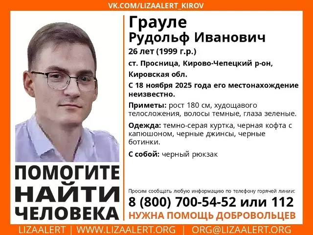 В Кировской области продолжаются активные поиски 26-летнего Рудольфа Ивановича Грауле, чье местонахождение неизвестно с 18 ноября 2025 года. Последний раз его видели в районе станции Просница Кирово-Чепецкого района. Об исчезновении сообщили волонтеры поисково-спасательного отряда "Лиза Алерт".
