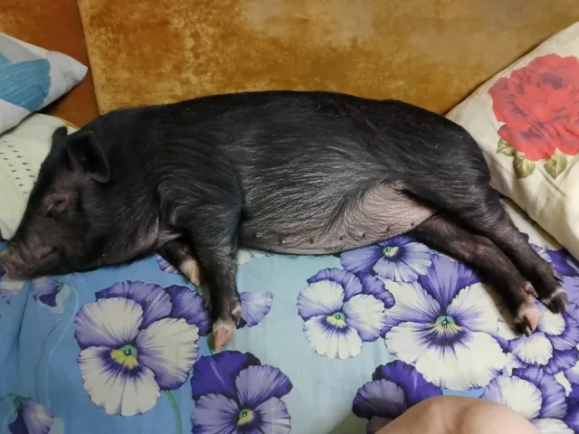 У свиньи есть свои лежанка и лоток. Местный житель выгуливал Розалию один раз в будний день и 2-3 раза в выходные. Сейчас у свинки все хорошо. По словам владельца, она занимает половину дивана.