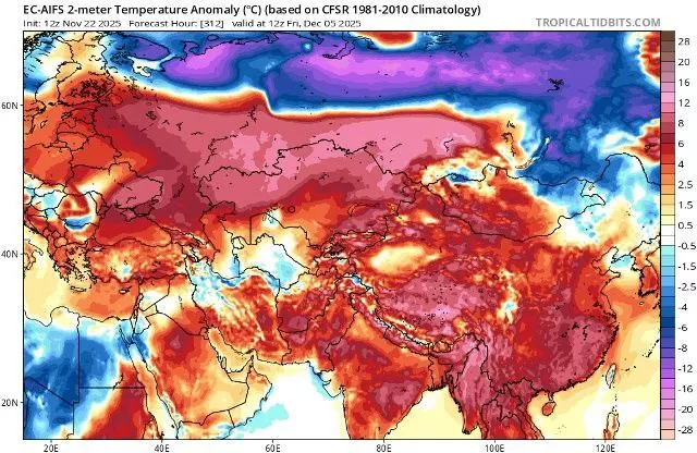 В субботу, 22 ноября, кировские метеолюбители представили прогноз на декабрь от одной из метеомоделей, работающих на основе искусственного интеллекта. Согласно ее анализу, в начале зимы рядом с Кировской областью пройдет граница двух погодных сценариев: аномального холода и аномального тепла.