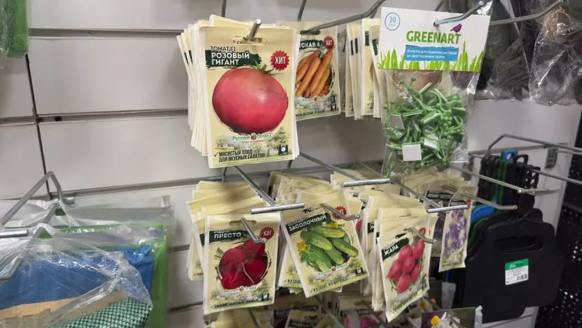 Мимо полок с семенами пройти оказалось невозможно. Ассортимент порадовал разнообразием: огурцы, томаты, редис, а также цветы — от вербены до астр и нарциссов.