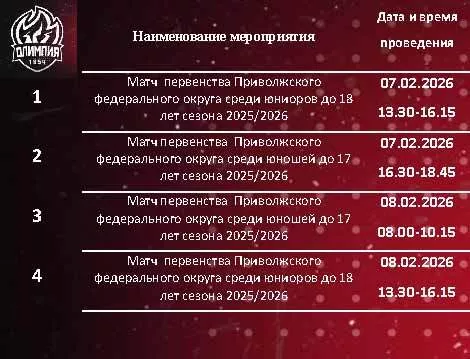 7 февраля 2026 года пройдут матчи первенства Приволжского федерального округа среди юношей. В 13:30 начнется игра среди юношей до 18 лет, которая продлится до 16:15. В тот же день в 16:30 стартует встреча среди юношей до 17 лет, которая завершится в 18:45.