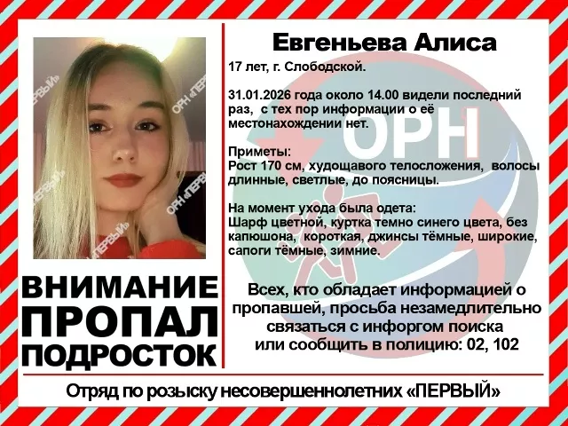 В субботу, 31 января 2026 года, около 14:00 в последний раз видели 17-летнюю Алису Евгеньеву в Слободском. С тех пор информация о ее местонахождении отсутствует.