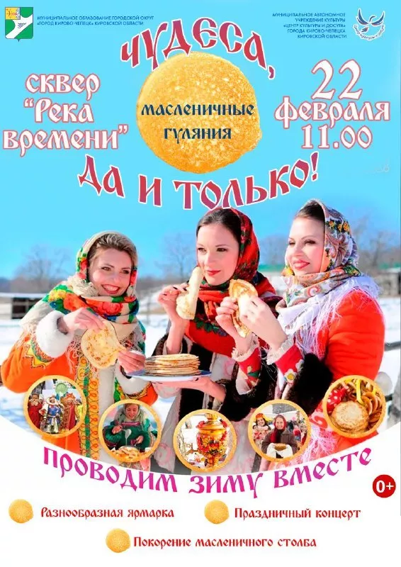 В мэрии сообщили, что масленичные гуляния пройдут в субботу, 22 февраля. Мероприятия под названием "Чудеса, да и только" (0+) запланированы в сквере "Река времени" в 11:00. По словам администрации, 22 февраля в Кирово-Чепецке запланирован праздник с русским размахом. Программа мероприятия: