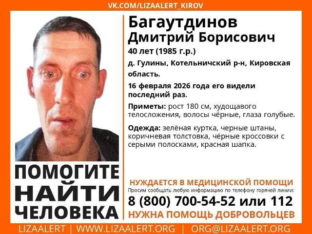 В последний раз Дмитрия Борисовича Багаутдинова видела в понедельник, 16 февраля 2026 года, в деревне Гулины Котельничского района. Приметы пропавшего 40-летнего мужчины: рост около 180 сантиметров, худощавое телосложение, волосы черные, а глаза голубые.