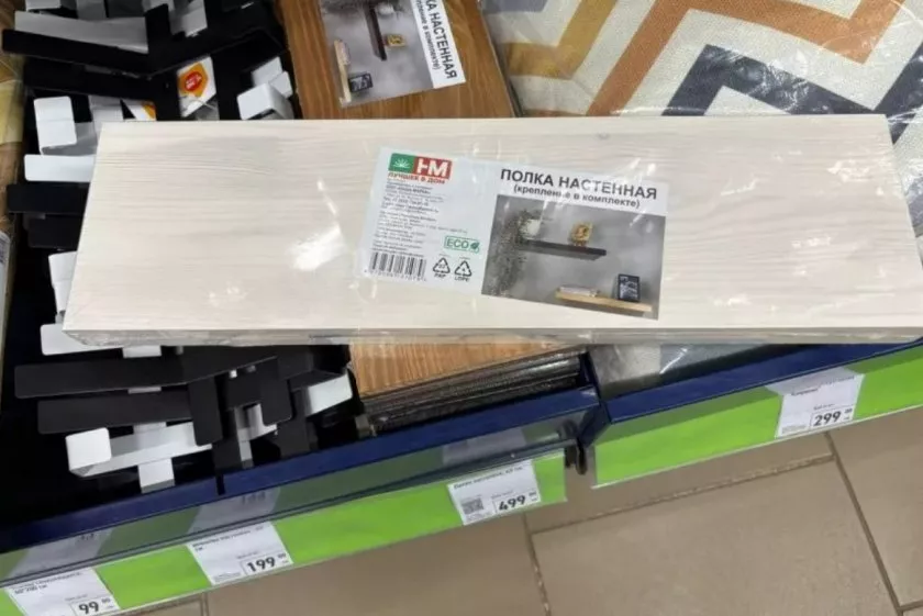 Рядом с панелями разместились настенные полки. Крепёж уже входит в комплект, цена — около 500 рублей. Полки представлены в трёх цветах: белые, под дерево и тёмные, что позволяет подобрать их под любой интерьер. Длина каждой — 45 сантиметров. Этого достаточно, чтобы поставить небольшие цветы или сложить книги.
