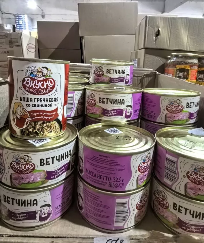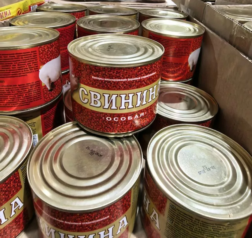 Консервы со свининой тоже прихватила. Мясо сочное, ароматное, можно и как самостоятельное блюдо использовать, и в готовку пустить. Для экспериментов на кухне самое то.