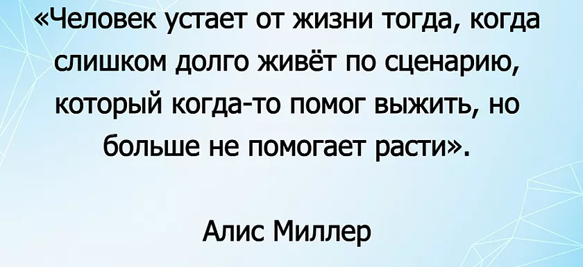 Психолог и исследователь детско-родительских отношений Алис Миллер описывала это состояние очень точно. Она отмечала, что люди могут годами оставаться в старых моделях поведения, даже когда они больше не помогают развиваться.