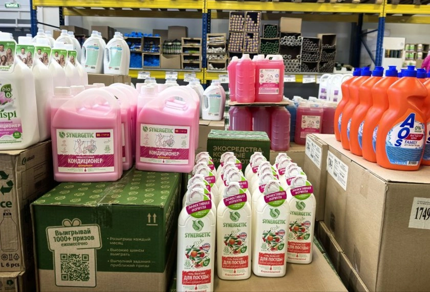 Дальше полки пестрят средствами от Synergetic (Синергетик): кондиционеры для белья, и гель-бальзам для посуды, обещающие чистоту и свежесть.
