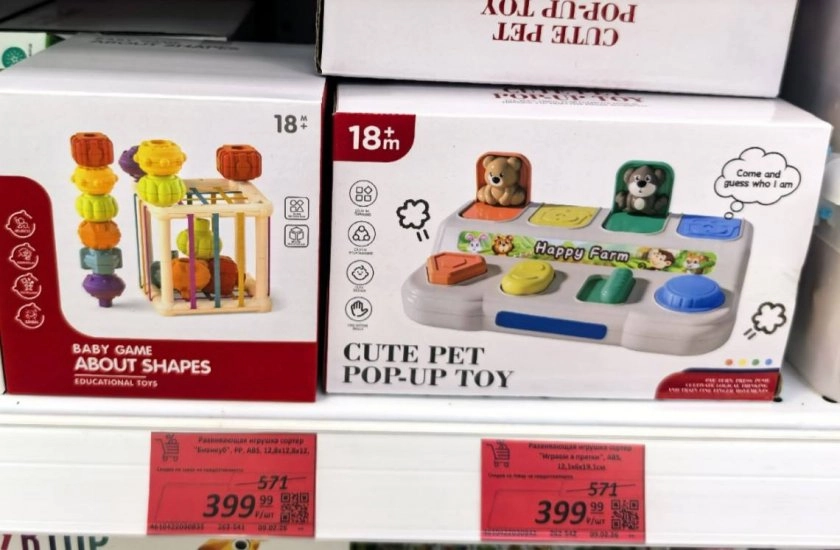 А для самых маленьких предлагается развивающая игрушка-сортер - стоит всего 399 рублей. Она тренирует логику и моторику.