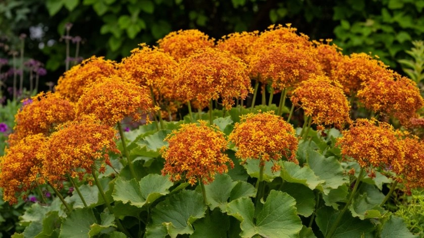 Бузульник (лигулярия) — крупное растение с эффектными листьями зеленого, бронзового или пурпурного оттенка. Цветет во второй половине лета желто-оранжевыми соцветиями, становясь ярким акцентом сада.