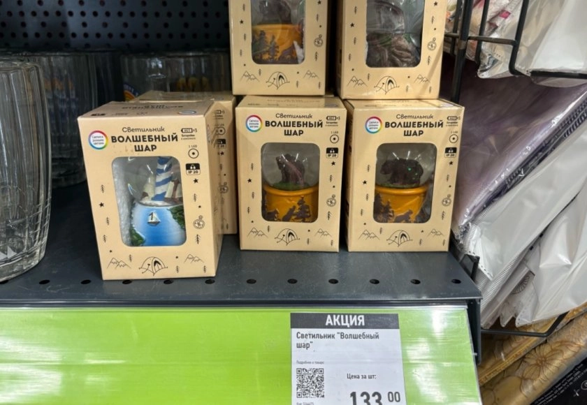Прямо у входа внимание привлекает компактный светильник под названием Волшебный шар. Стоимость в сто тридцать три рубля делает эту покупку практически импульсивной, однако дизайн изделия заслуживает более серьезного отношения. Фигурка мишки, держащего в лапах источник мягкого света, добавляет интерьеру нотку детской непосредственности и тепла.