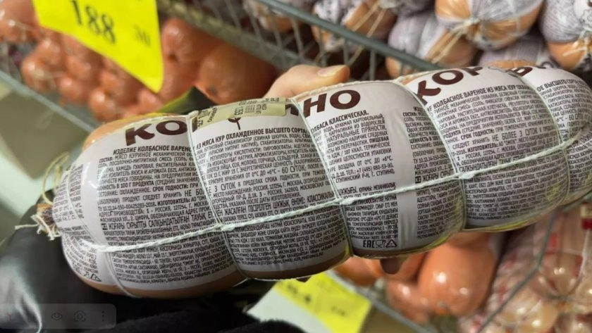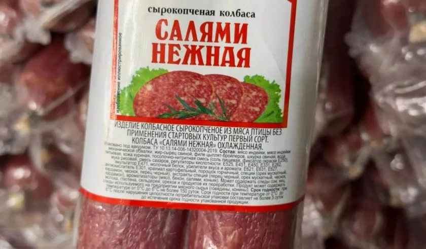 Срез плотный, с мраморными прожилками. В составе — свинина и птица, вкус насыщенный, без резких приправ. На столе выглядит солидно. Цена — 284 рубля.