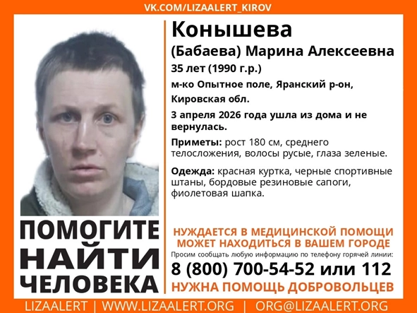 В пятницу, 3 апреля, кировские поисковики опубликовали ориентировку на Марину Алексеевну Конышеву (Бабаеву). 35-летняя жительница Яранского района из местечка Опытное Поле таинственным образом пропала в указанный день. По данным поисковиков, ее могли заметить на федеральной трассе "Вятка".