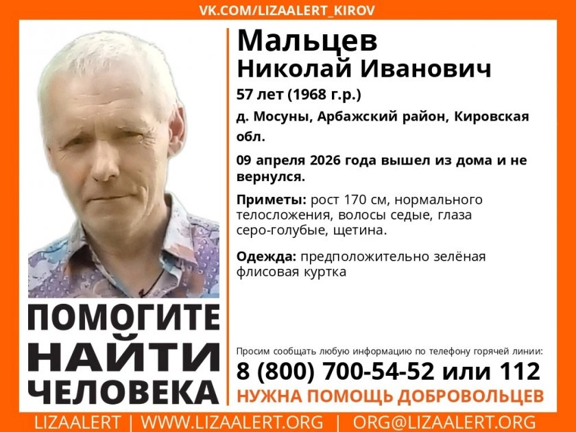 Пропал 58-летний Иван Николаевич Мальцев. Он живет в деревне Мосуны Арбажского района. 9 апреля 2026 года мужчина вышел из дома и до сих пор не вернулся. С тех пор о его местонахождении ничего неизвестно.