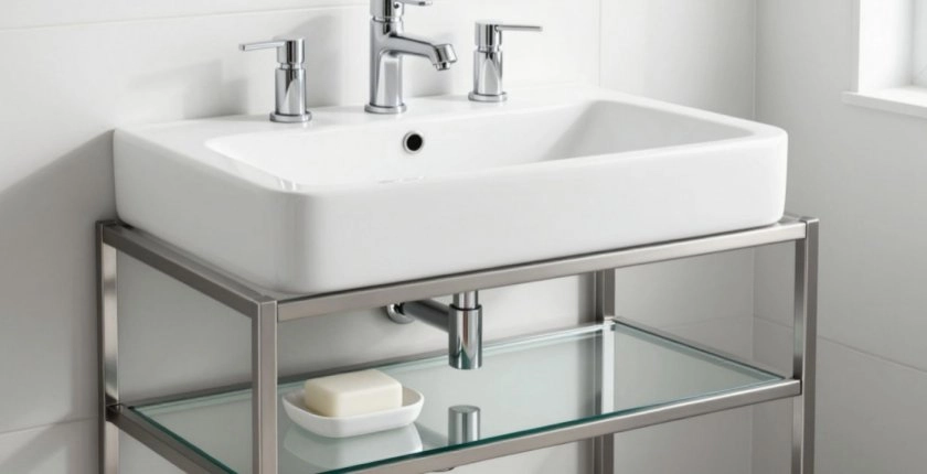 Вместо закрытого шкафа к стене крепят конструкцию из нержавейки или чёрного металла с полкой из влагостойкого МДФ или стекла. Раковина монтируется отдельно, а под ней стоит открытая этажерка для корзин и принадлежностей. Под такой конструкцией легко мыть пол. Минус — всё, что хранится на полках, видно. Поэтому баночки и флаконы должны выглядеть аккуратно.