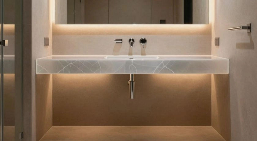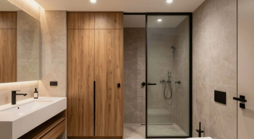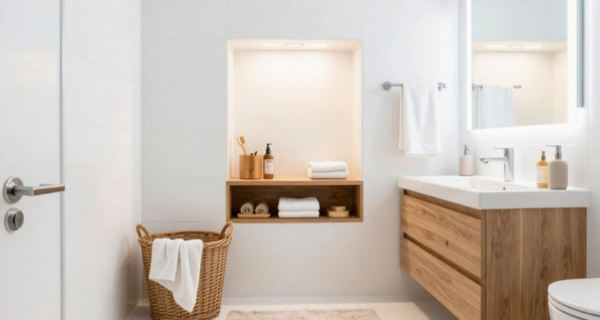 Система хранения встраивается в стену. За гипсокартоном или панелями прячут глубокий короб с выдвижными ящиками и полками. Снаружи — ровная поверхность с фасадами в цвет стены. Мебель становится частью архитектуры. В маленьких ванных это экономит место. Нужно только сделать вентиляцию, чтобы не скапливалась сырость.